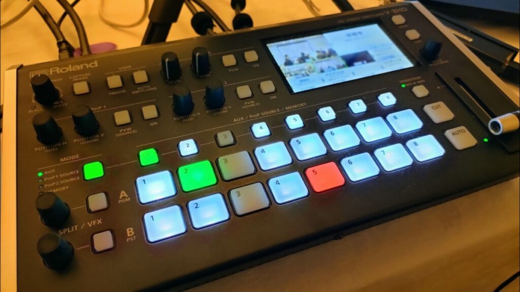 具体的な方法としては、今回はカメラを2台用意して、2つの映像をスイッチャーで合流、内容に応じて随時2つのカメラを切り替えながら配信させていただきました。